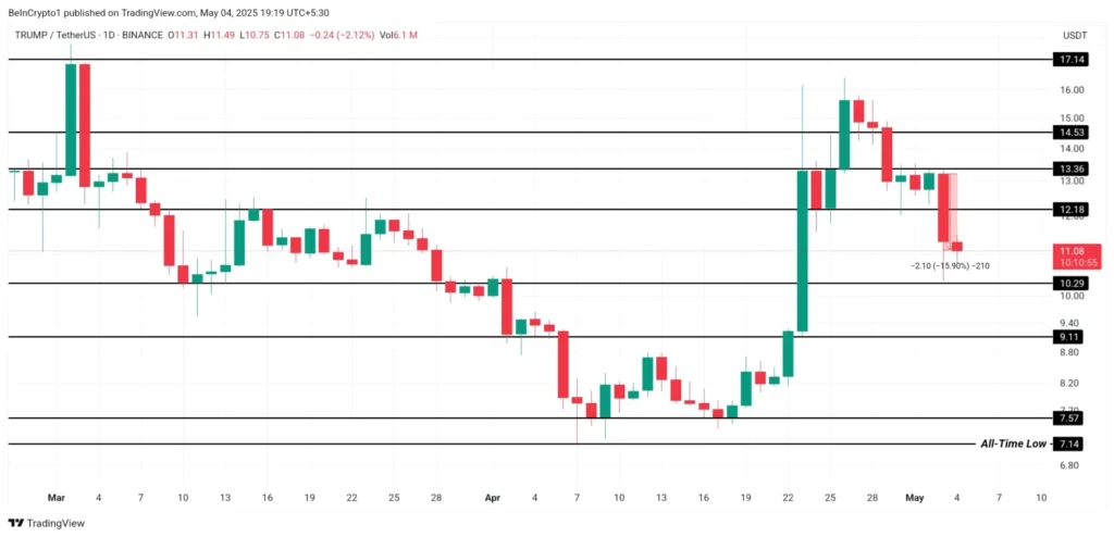 Hiện tại, TRUMP đang giao dịch quanh mức 11.08 USD, chỉ vài giờ sau khi giảm 16% trong vòng 24 tiếng. Mức giảm này được kích hoạt sau khi đồng coin không thể vượt qua ngưỡng kháng cự quan trọng ở 16.00 USD. Sự nỗ lực thất bại này đã dẫn đến áp lực bán gia tăng, làm giá TRUMP tụt dốc mạnh mẽ.