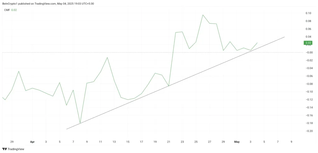 Mặc dù giá TRUMP giảm mạnh hôm nay, các chỉ số vĩ mô cho thấy sự lạc quan từ phía nhà đầu tư. Chỉ số Chaikin Money Flow (CMF) vẫn duy trì ở mức dương, cho thấy rằng dòng tiền vẫn đang chảy vào tài sản này. Tín hiệu tích cực này cho thấy rằng người mua vẫn đang chiếm ưu thế, kể cả khi thị trường có diễn biến yếu kém trong thời gian vừa qua.