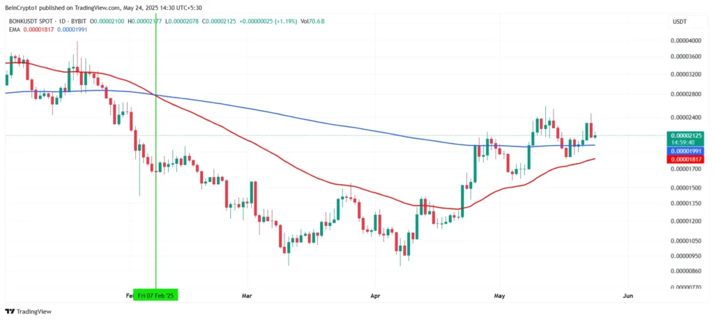 Sự lạc quan của các nhà đầu tư đang ngày càng tăng, được thể hiện rõ qua khối lượng giao dịch và thái độ tích cực của thị trường. Sự kỳ vọng vào Golden Cross đang thúc đẩy sự quan tâm đến việc mua vào BONK, và điều này có thể sẽ khuếch đại động lực tăng giá cũng như hỗ trợ cho việc phục hồi giá trị của đồng altcoin này.