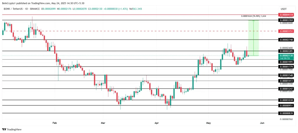 Hiện tại, BONK đang được giao dịch ở mức 0.00002130 USD và đang phải đối mặt với ngưỡng kháng cự tại mức 0.00002285 USD. Để có thể phục hồi hoàn toàn các khoản thiệt hại từ đầu năm 2025, BONK cần phải tăng khoảng 77%,đạt được mức 0.00003769 USD.