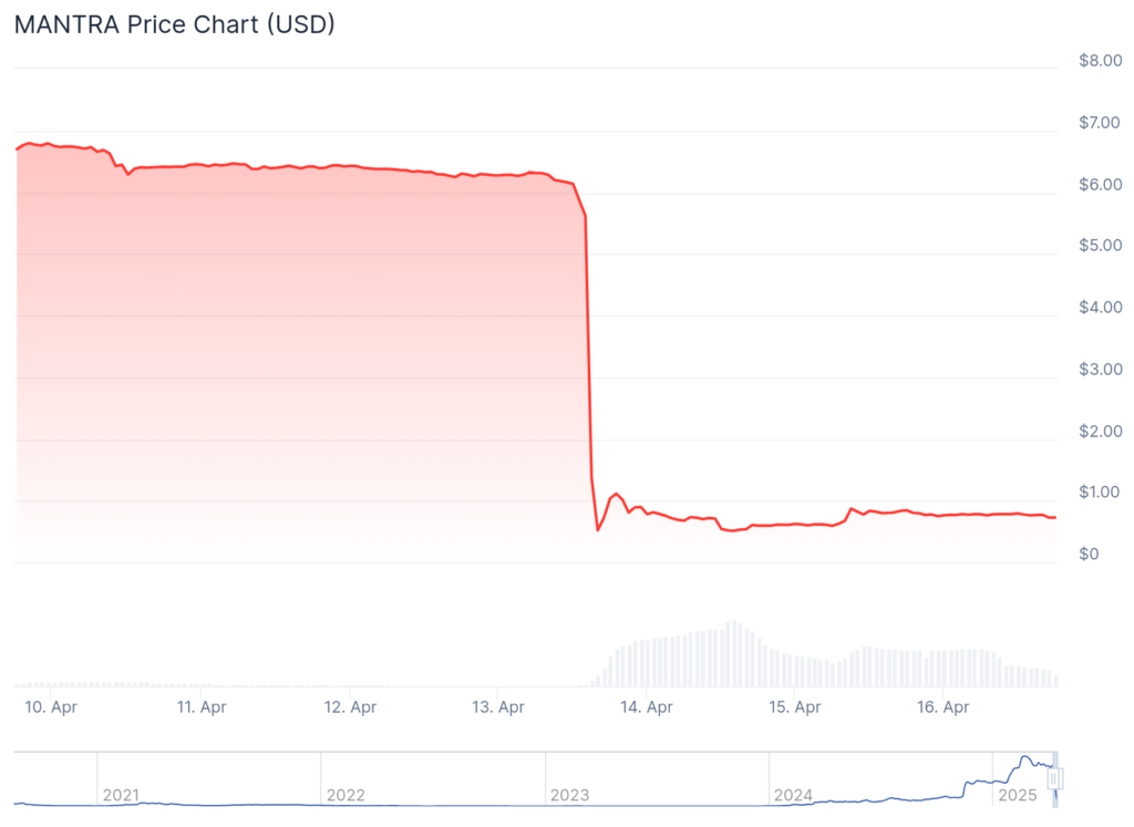 Vào thứ Hai, token MANTRA đã trải qua một cú sốc lớn, với giá trị giảm hơn 90% chỉ trong vòng chưa đầy một giờ, dẫn đến việc hơn 5,5 tỷ USD vốn hóa thị trường bị xóa sổ. Mức giá trước đó là 6.33 USD đã tụt xuống dưới 0.50 USD, khiến cho cộng đồng nhà đầu tư rơi vào tình trạng chấn động.