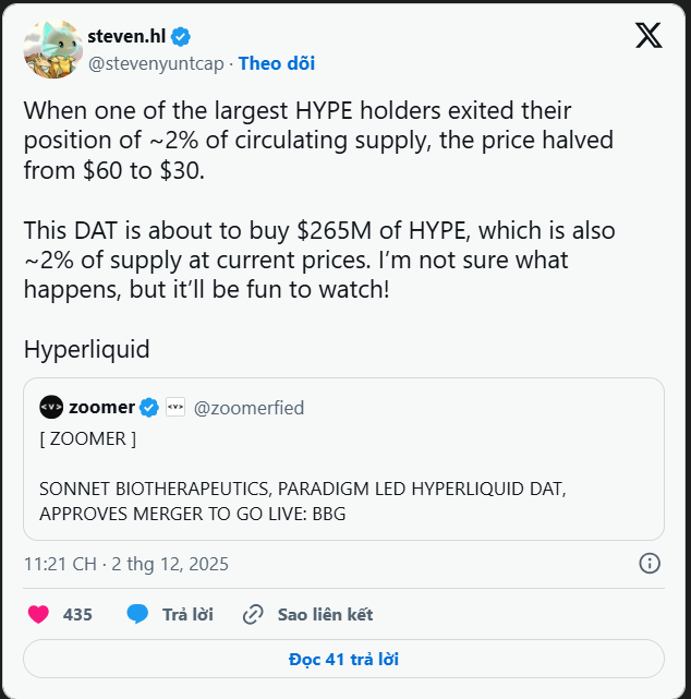 “Khi một trong những nhà nắm giữ HYPE lớn nhất thoát khỏi vị thế chiếm khoảng 2% nguồn cung lưu hành, giá giảm từ 60 USD xuống còn 30 USD. Sau đó, DAT này dự kiến mua 265 triệu USD HYPE, cũng chiếm khoảng 2% nguồn cung. Thật thú vị để theo dõi diễn biến tiếp theo của thị trường này.”