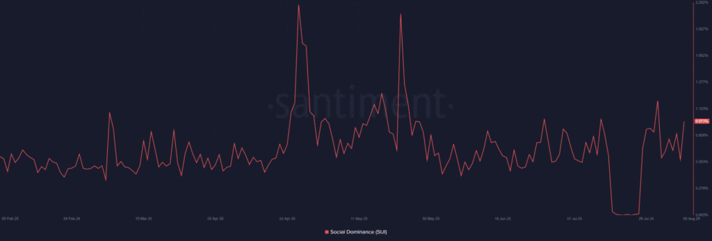 Dữ liệu từ Santiment cho thấy Tỷ lệ thống trị xã hội của SUI đã đạt đỉnh 2,2% vào ngày 5 tháng 8 – một con số cao nhất trong nhiều tháng qua. Việc gia tăng thảo luận trực tuyến có thể đang tạo ra kỳ vọng tích cực trên thị trường. Theo lịch sử, các đợt tăng mạnh tương tự thường báo hiệu sự biến động giá sắp xảy ra, đặc biệt là khi có các yếu tố hỗ trợ mạnh.