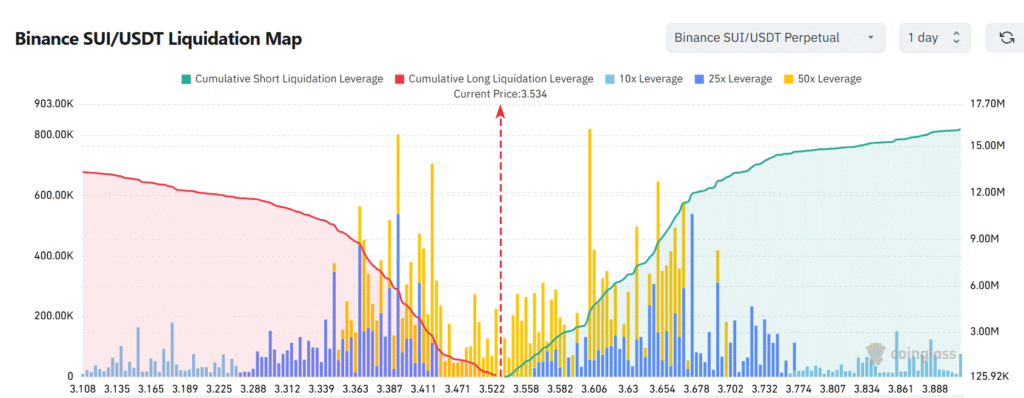 Bản đồ thanh lý hiện tại chỉ ra rằng giá SUI đang nằm trên một khu vực chứa nhiều lệnh thanh lý Short. Trong khi đó, áp lực thanh lý ở phía trên hiện tại khá nhẹ cho đến khoảng 3,88 đô la. Sự chênh lệch này có thể dẫn đến một “Short Squeeze” nếu bên mua đẩy giá lên cao hơn.