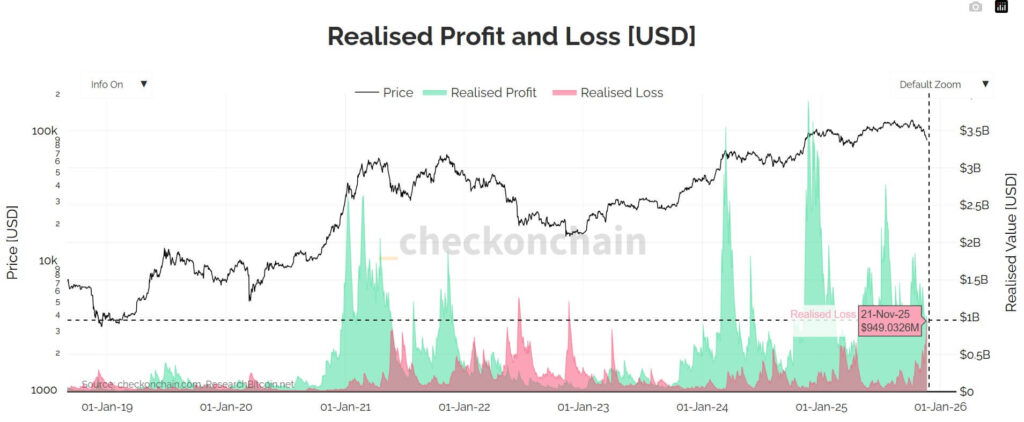 Dữ liệu từ CheckOnChain chỉ rõ rằng ngày 21/11 vừa qua, các nhà đầu tư đã ghi nhận khoảng 1 tỷ USD thua lỗ – một trong những ngày thua lỗ nặng nề nhất trong năm 2023. Áp lực bán này chủ yếu xuất phát từ các holder nắm giữ Bitcoin dưới 3 tháng, nhóm phản ứng nhanh nhất với các biến động giá và thường thoát khỏi vị thế khi thị trường bắt đầu suy yếu.