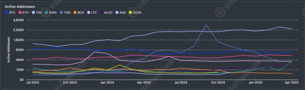 Trong khoảng thời gian từ tháng 7 năm 2023 cho đến tháng 4 năm 2025, số lượng địa chỉ hoạt động của Ethereum, một chỉ số quan trọng phản ánh sự tiện ích và tăng trưởng người dùng, đã chỉ duy trì trong khoảng từ 400.000 đến 600.000 địa chỉ. Trong khi đó, các nền tảng cạnh tranh như Tron (TRX) đã ghi nhận số lượng địa chỉ hoạt động vượt hơn 2,5 triệu, và Ton (TON) cũng từng đạt đến 3,6 triệu địa chỉ. Sự chênh lệch này cho thấy Ethereum đang tụt lại phía sau trong việc thu hút người dùng mới, một vấn đề nghiêm trọng trong bối cảnh thị trường tiền điện tử cạnh tranh.