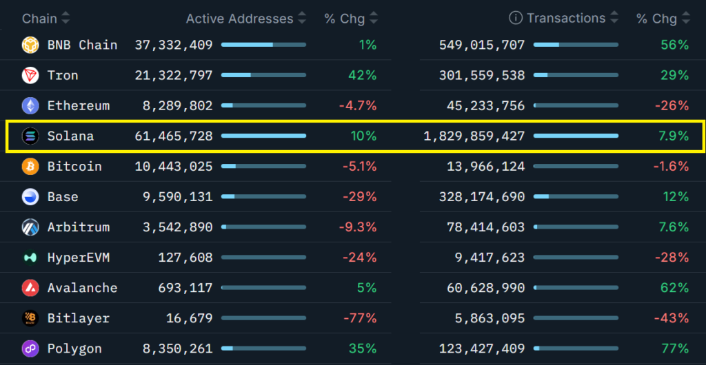 Mặc dù giá giảm, hoạt động trên mạng lưới Solana vẫn duy trì đà tăng trưởng tích cực. Trong vòng 30 ngày, số lượng địa chỉ hoạt động đã tăng 10%, số giao dịch tăng 8%, thể hiện sự hấp dẫn của hệ sinh thái này. Ngược lại, Ethereum và các đối thủ cạnh tranh khác lại ghi nhận xu hướng sụt giảm về hoạt động on-chain, cho thấy sức hút của Solana vẫn còn tiềm năng.
