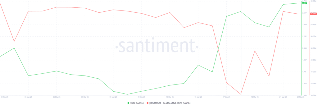 Một trong những yếu tố chính góp phần vào sự phát triển mạnh mẽ của CAKE là sự gia tăng hoạt động của các địa chỉ cá voi. Trong vòng 4 ngày qua, những địa chỉ này đã tích lũy được 25 triệu CAKE, tương đương khoảng 69 triệu USD. Sự tích lũy này đã diễn ra sau sự tăng giá 50% trong tuần và phản ánh niềm tin vững chắc vào tiềm năng tương lai của PancakeSwap.
