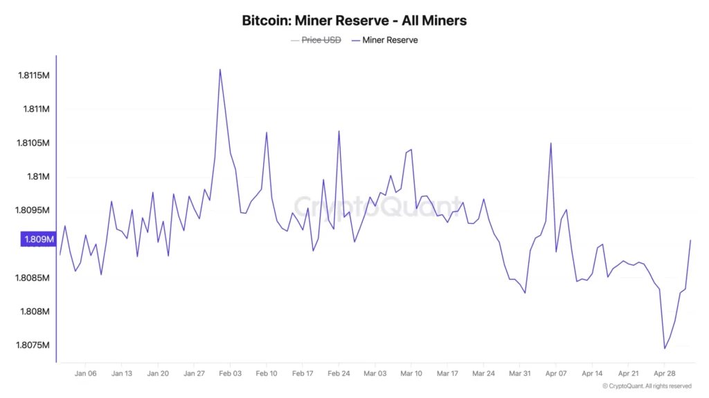 Theo một số dữ liệu được cung cấp bởi CryptoQuant, một nền tảng phân tích dữ liệu blockchain, dự trữ BTC của các thợ đào đã có sự gia tăng đáng kể kể từ ngày 29/04/2025, ngay sau khi BTC đóng cửa trên mốc 95,000 USD. Trước thời điểm này, dự trữ của các thợ đào đã chạm mức thấp nhất trong năm, chỉ còn 1.80 triệu BTC. Sự chuyển biến này cho thấy các thợ đào đã bắt đầu tích lũy coin thay vì bán ra, điều đó phản ánh niềm tin vào khả năng tăng giá trong tương lai của Bitcoin.