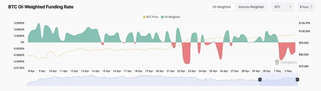 Dẫu cho sự lạc quan của các thợ đào, tình hình trên thị trường phái sinh lại phản ánh một bức tranh hoàn toàn khác. Tỷ lệ tài trợ của BTC trên thị trường hợp đồng tương lai đã duy trì ở mức âm kể từ đầu tháng Năm, báo hiệu rằng một bộ phận đáng kể các nhà giao dịch đang đặt cược vào khả năng điều chỉnh giá ngắn hạn. Tại thời điểm viết bài, tỷ lệ tài trợ này đạt -0.0056%.