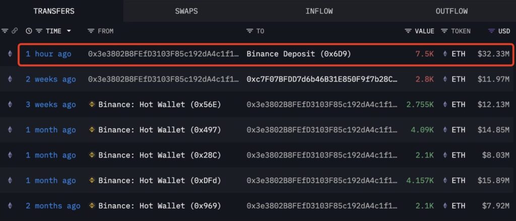 Thời gian gần đây, giá Ethereum (ETH) đang diễn biến ổn định, nhưng những hoạt động bán tháo từ các nhà đầu tư lớn (cá voi) đang tạo ra nhiều lo ngại cho thị trường. Theo thông tin từ Lookonchain, một ví cá voi nổi tiếng với địa chỉ 0x3e38 vừa thực hiện giao dịch bán 7.500 ETH, trị giá khoảng 32,33 triệu USD, trên sàn giao dịch Binance. Dẫu cho việc bán ra quy mô lớn, ví này vẫn còn giữ lại 7.702 ETH (tương đương khoảng 33 triệu USD). Trong giai đoạn từ 20/7 đến 12/8, ví này đã rút tổng cộng 15.202 ETH với mức giá trung bình là 3.869 USD, cho thấy cá voi đang cố gắng hiện thực hóa lợi nhuận khi giá ETH chưa có nhiều biến động.