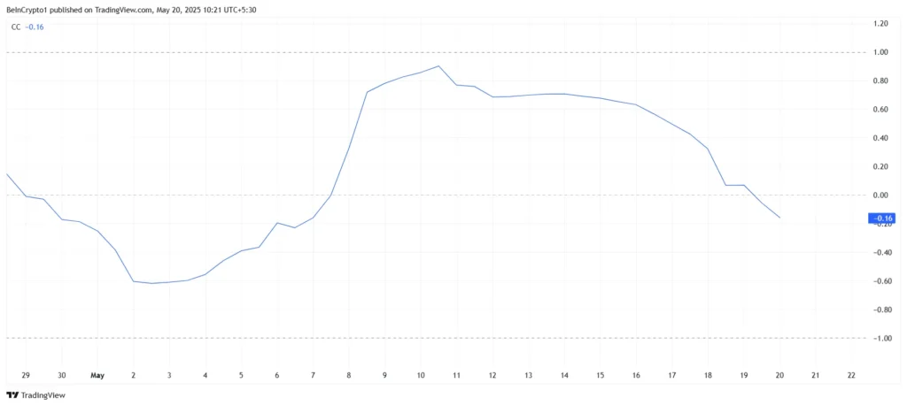 Trước đây, mối liên kết giữa Pi Network và Bitcoin đã từng được xem là yếu tố giúp củng cố giá trị của nó. Tuy nhiên, sự tương quan này hiện đã giảm xuống còn -0.16, cho thấy Pi Network đang tách biệt khỏi Bitcoin. Điều này là một tín hiệu báo động, đặc biệt khi Bitcoin vẫn giữ được mức giá ổn định, dao động xung quanh 106,000 USD và có tiềm năng đạt được mức cao nhất mọi thời đại.