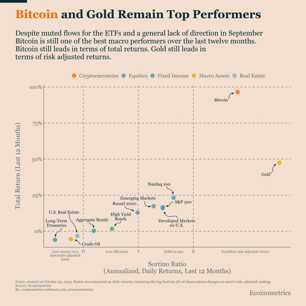 Theo nền tảng phân tích Ecoinometrics, mặc dù Bitcoin mang lại lợi nhuận tuyệt đối cao hơn, vàng vẫn thể hiện ưu thế về hiệu suất rủi ro. Điều này cho thấy xu hướng dài hạn của giới đầu tư đang dịch chuyển hướng về các tài sản cứng – những tài sản có tính ổn định và khả năng chống chịu tốt hơn trong bối cảnh Mỹ bước vào thời kỳ “thống trị tài khóa”.