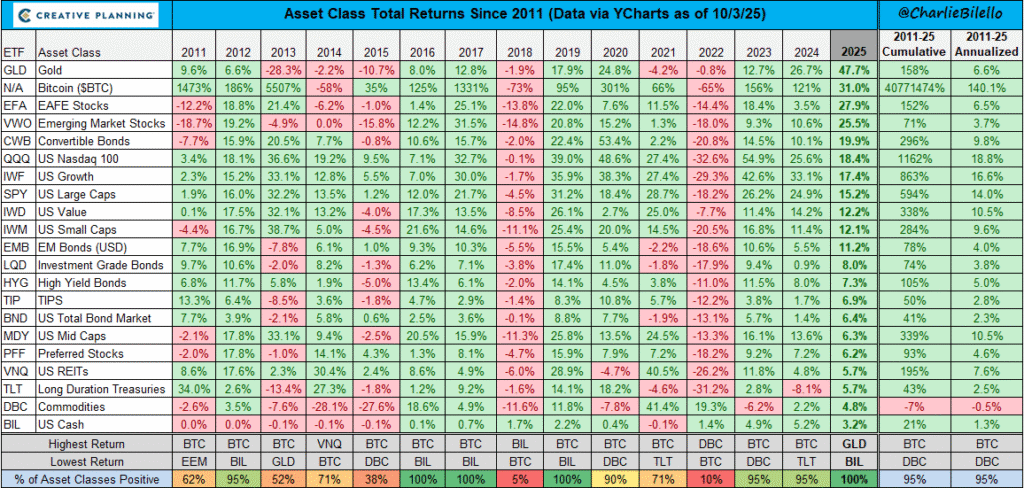 Chúng ta có thể thấy, đây là lần đầu tiên trong lịch sử, vàng và Bitcoin đồng thời giữ vị trí dẫn đầu về hiệu suất tăng trưởng trong cùng một năm dương lịch, phản ánh rõ nét xu hướng đầu tư mới dựa trên các yếu tố vĩ mô toàn cầu.