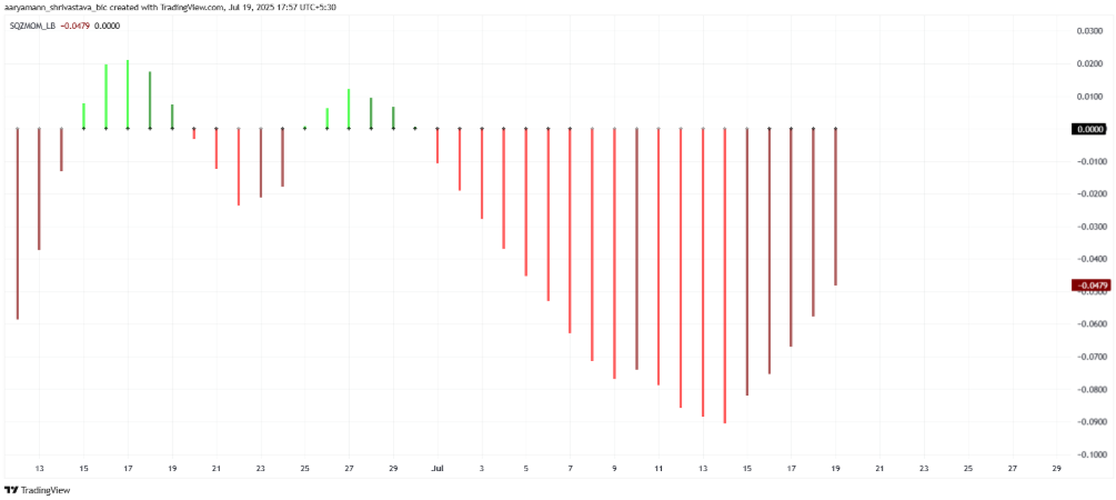 Bất chấp xu hướng hiện tại còn nhiều khó khăn, chỉ báo Squeeze Momentum lại chỉ ra cơ hội tiềm năng cho việc tích lũy động lượng tăng giá. Việc xuất hiện các chấm đen trên biểu đồ có thể ám chỉ một giai đoạn “nén” trước khi có sự biến động mạnh mẽ xảy ra.