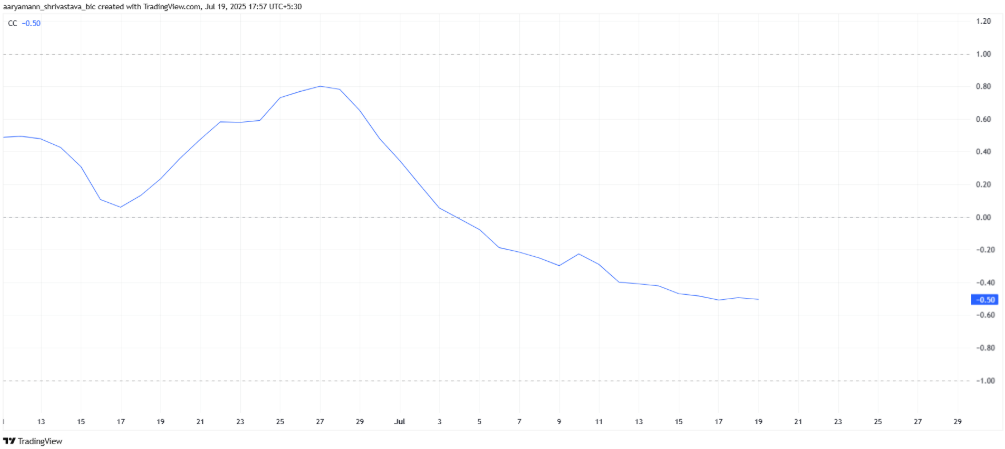 Một trong những nguyên nhân chủ yếu dẫn đến xu hướng giá tiêu cực của Pi Coin là sự suy giảm trong mối quan hệ giữa nó và Bitcoin. Mối tương quan này hiện nay đã giảm xuống chỉ còn -0,50, cho thấy hai tài sản đang có diễn biến ngược chiều. Trong khi Bitcoin vừa qua có xu hướng tăng giá, thì Pi Coin lại tụt dốc, khiến nhiều nhà đầu tư trở nên lo ngại về triển vọng hồi phục của đồng tiền này.