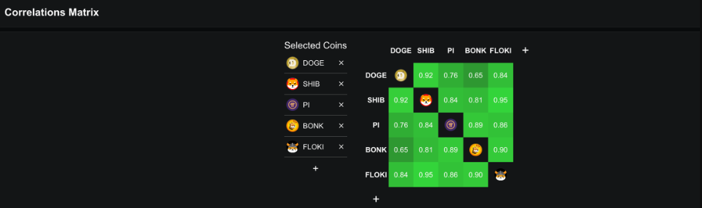 Dữ liệu tương quan từ DeFillama cho thấy hành vi thị trường của Pi Coin đã có sự thay đổi đáng kể. Cụ thể, hiện tại Pi Coin có hệ số tương quan 0,76 với Dogecoin, 0,84 với Shiba Inu, 0,89 với Bonk, và 0,86 với Floki.