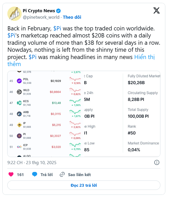 - Giá trị hiện tại: Pi token đang giao dịch quanh mức 0,20 đô la Mỹ, giảm mạnh so với đỉnh.