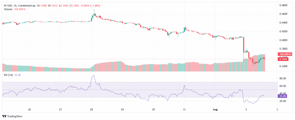 Trong vòng 24 giờ qua, giá của Pi Coin đã giảm hơn 5%, với mức thấp đạt 0,3528 đô la sau khi đã chạm đáy tại 0,341 đô la. Điều đáng lưu ý là khối lượng giao dịch gia tăng mạnh mẽ, đạt 168 triệu đô la, tương đương với mức tăng 86%, cho thấy áp lực bán đang gia tăng một cách đáng kể.