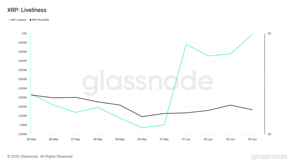 Theo các báo cáo từ Glassnode, trong suốt tháng 6, sự sống động của XRP đã có dấu hiệu gia tăng, phản ánh rằng nhiều nhà đầu tư dài hạn đang tận dụng cơ hội này để di chuyển hoặc bán tài sản của họ. Chỉ số sự sống động đã đạt mức 0.809 vào ngày 3 tháng 6, cho thấy có một làn sóng chuyển nhượng coin từ các ví không hoạt động sang các ví đang hoạt động. Điều này thường là dấu hiệu cho thấy các LTH bắt đầu chốt lời.