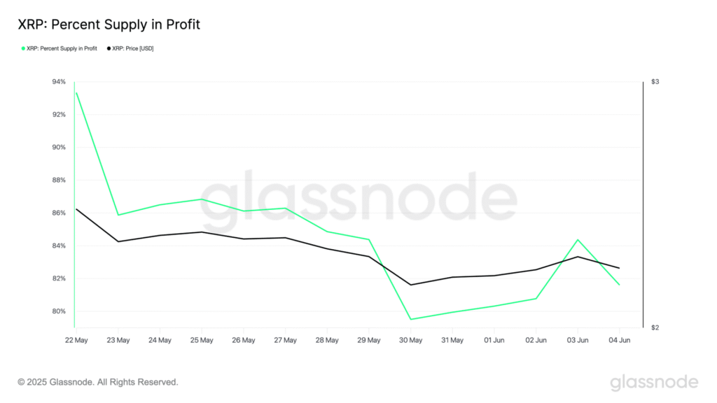 Phân tích từ Glassnode cũng chỉ ra rằng sau khi đạt mức thấp nhất trong nhiều tháng với 79% nhà đầu tư XRP đang thua lỗ vào cuối tháng 5, con số này đã đảo chiều. Hiện tại, 82% các nhà đầu tư ở mức lợi nhuận chưa thực hiện. Khi giá XRP tăng lên và nhiều nhà giao dịch đang ở trong trạng thái có lãi, động lực chốt lời sẽ trở nên mạnh mẽ, có nguy cơ dẫn đến một làn sóng bán tháo, từ đó gây áp lực giảm đến giá của token này và làm giảm đà tăng gần đây.