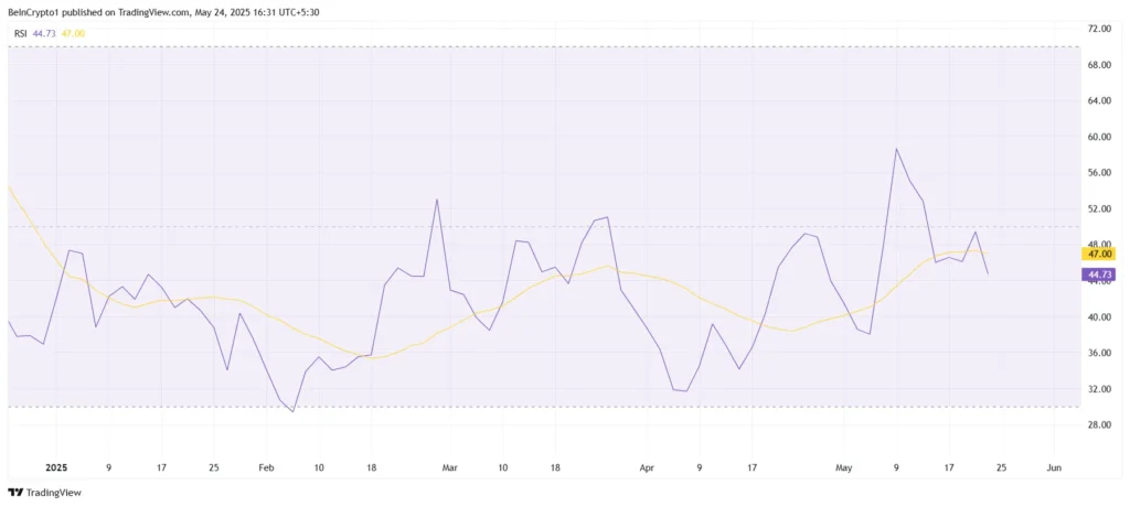 Bên cạnh đó, Chỉ số Sức mạnh Tương đối (RSI) từng ghi nhận một đợt tăng giá nhưng nhanh chóng quay trở lại dưới mức 50, cho thấy động lực tăng giá đang thiếu vững chắc. Không có dòng tiền mới vào cũng như áp lực bán mạnh có thể cản trở bất kỳ khả năng nào nhằm bứt phá khỏi vùng kháng cự.