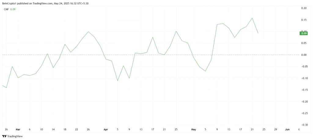 Thời điểm hiện tại, Celestia rơi vào tình trạng thiếu sự tin tưởng từ phía nhà đầu tư. Sự do dự này khiến altcoin này vẫn chưa thể bứt phá vươn lên một xu hướng tăng rõ rệt. Tuy nhiên, có một số tín hiệu hỗ trợ từ phía nhà đầu tư với việc Chỉ báo Chaikin Money Flow (CMF) gần đây đã ghi nhận một sự gia tăng nhẹ, dù vẫn nằm dưới mức 0. Điều này thể hiện rằng, mặc dù có một dòng vốn vào nhất định, sự tự tin trong việc đầu tư TIA vẫn chưa đủ mạnh.