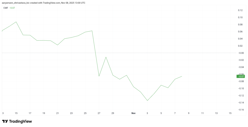 Chỉ báo CMF ghi nhận mức tăng nhẹ trong vài ngày gần đây, cho thấy dòng tiền vào thị trường đã có dấu hiệu cải thiện. Tuy nhiên, mức độ này vẫn chưa đủ để xác nhận một xu hướng đảo chiều rõ ràng.