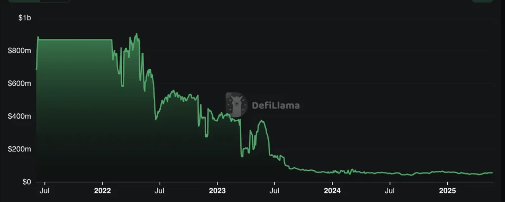 Theo dữ liệu từ DefiLama, Tổng Giá Trị Khóa (TVL) của Alpaca Finance đã đạt mức đỉnh vượt quá 900 triệu USD vào đầu năm 2022. Tuy nhiên, kể từ đó, TVL đã không ngừng giảm sút. Thông tin mới nhất cho thấy TVL hiện chỉ còn 54.6 triệu USD, một con số đáng thất vọng đối với một dự án từng có tầm ảnh hưởng lớn trong thị trường DeFi.