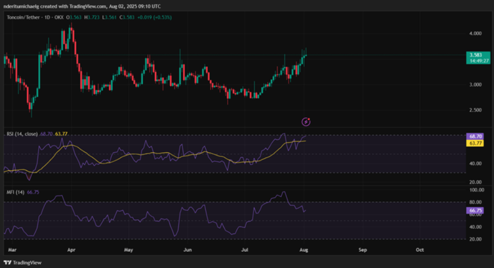 Gần đây, giá của Toncoin đã vươn tới ngưỡng 3,7 USD, chạm mức kháng cự được thiết lập từ tháng 5, trước khi điều chỉnh nhẹ xuống khoảng 3,5 USD vào thời điểm hiện tại. Tuy nhiên, theo phân tích kỹ thuật, Toncoin vẫn chưa bị coi là quá mua. Chỉ báo Money Flow Indicator (MFI) đã bắt đầu cho thấy dấu hiệu sức hút dòng tiền giảm sút, với nhiều nhà đầu tư chọn chốt lời sau những đợt tăng nhanh.