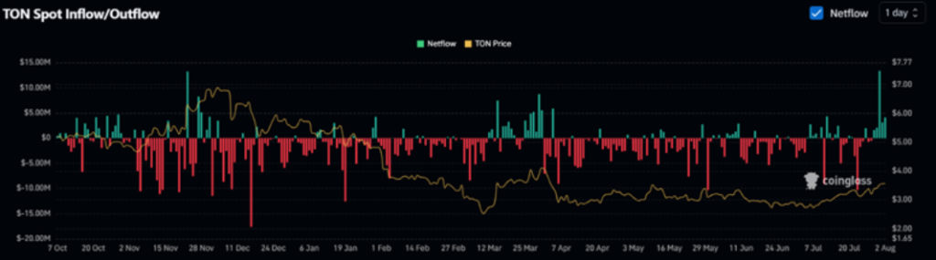 Đà tăng trưởng ấn tượng của Toncoin phần lớn đến từ sự gia tăng dòng tiền đầu tư vào thị trường giao ngay. Ngày 31/7 vừa qua, dòng tiền ròng tại thị trường spot đã lên tới 13,35 triệu USD, đạt mức cao nhất từ đầu năm, cho thấy sự tin tưởng mạnh mẽ của nhà đầu tư vào tiềm năng phục hồi của đồng coin này.