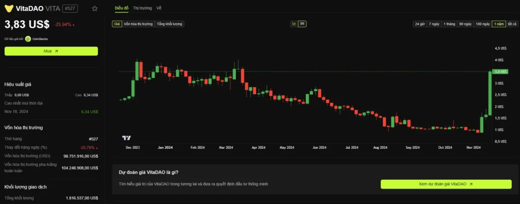 Về khía cạnh tokenomics, vốn hóa hiện tại của VITA chưa tới 100 triệu USD, trong đó 40% tổng cung 64.3 triệu VITA đã được phát hành ra thị trường. Mặc dù khối lượng giao dịch hàng ngày hiện tại chỉ khoảng 1.8 triệu USD, nhưng mức giá VITA đã ghi nhận sự tăng trưởng ấn tượng, gấp 4 lần trong tháng 11 và hiện đang giao dịch quanh mức 3.5 USD. Dự án đã thu hút được sự chú ý từ nhiều nhà đầu tư lớn như Balaji Srinivasan và Pfizer Venture Investments.