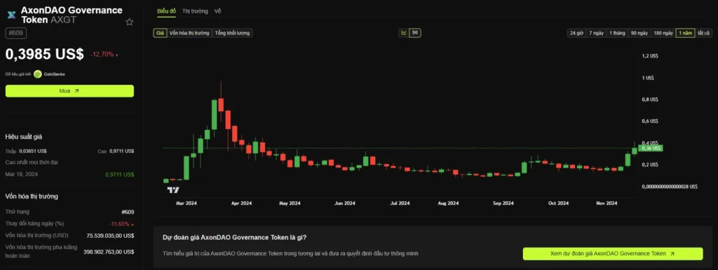 Dù AxonDAO vẫn đang trong giai đoạn phát triển roadmap và chưa có ứng dụng thực tế cụ thể nào, nhưng sự quan tâm đối với DeSci gần đây đã giúp tăng vốn hóa của AXGT lên tới 75 triệu USD. Khối lượng giao dịch hiện chưa đến 1 triệu USD, nhưng giá AXGT đã tăng gấp 4 lần trong tháng vừa qua.