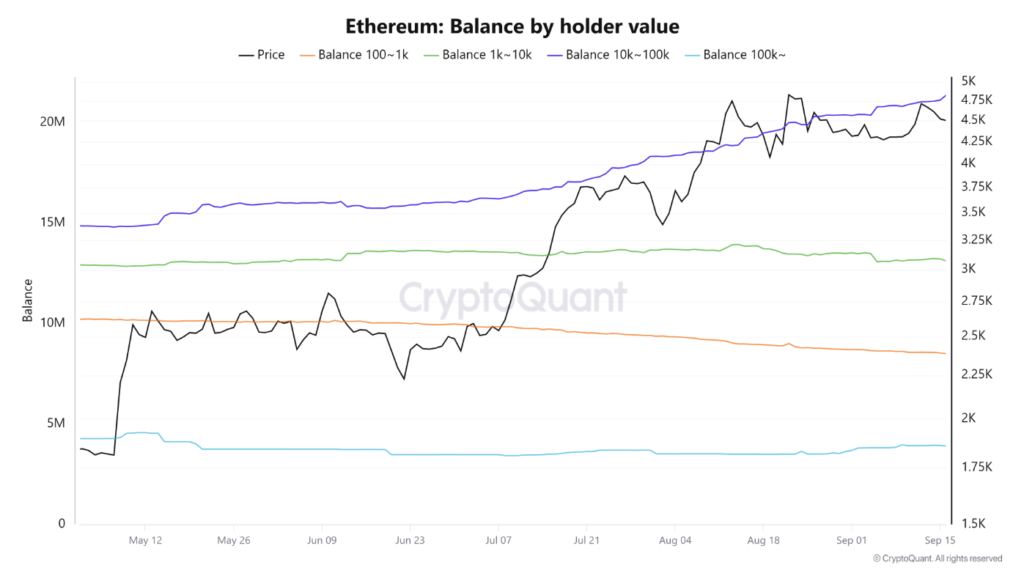Các địa chỉ nắm giữ từ 10.000 đến 100.000 ETH, được gọi là “cá voi”, đã thu mua thêm 1 triệu ETH kể từ đầu tháng 9, mang tổng lượng nắm giữ lên đến 21,39 triệu ETH. Điều này diễn ra song song với việc nhiều nhà đầu tư nhỏ lẻ thực hiện chốt lời và có dấu hiệu phân bổ giá trị nhẹ nhàng.