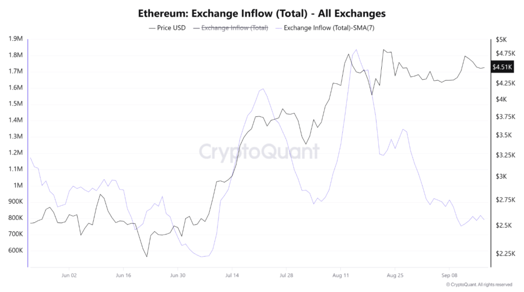Song song với nhu cầu đang gia tăng, nguồn cung ETH trên sàn giao dịch cũng có dấu hiệu giảm. Theo báo cáo từ CryptoQuant, lượng ETH nạp vào sàn giao dịch theo trung bình động 7 ngày đã giảm mạnh từ 1,8 triệu ETH vào giữa tháng 8 xuống còn 783.000 ETH—mức thấp nhất kể từ tháng 7.