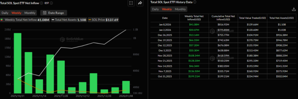 Theo dữ liệu từ SoSoValue, dòng tiền vào các quỹ ETF Solana giao ngay đã ghi nhận mức tăng đáng kể, đạt 41,08 triệu USD trong tuần này — mức cao nhất kể từ giữa tháng 12. Đây là tín hiệu rõ ràng về sự quan tâm ngày càng tăng của các nhà đầu tư tổ chức đối với tài sản số này. Tổng tài sản ròng của các ETF này đã vượt mốc 1,10 tỷ USD, phản ánh sự tin tưởng và kỳ vọng tích cực vào tiềm năng tăng trưởng của Solana trong dài hạn.