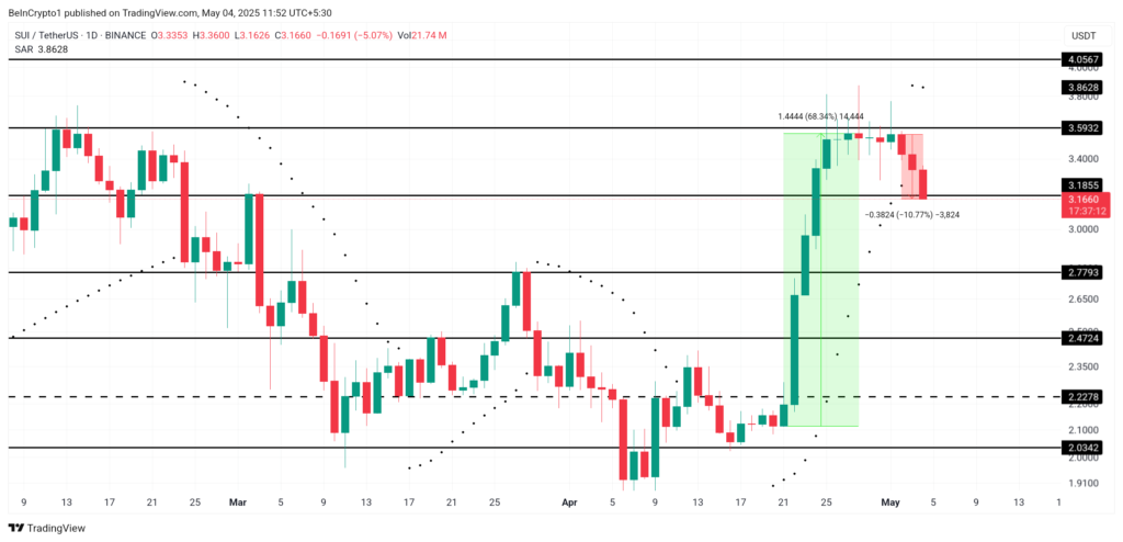 Dù vậy, viễn cảnh phục hồi cũng không phải là điều hiển nhiên. Nếu SUI không thể nhanh chóng lấy lại mức 3.16 USD, nó có thể đối mặt với nguy cơ giảm sâu hơn. Việc không thể vượt qua mức 3.39 USD hoặc giữ vững hỗ trợ tại 3.18 USD có khả năng khiến giá của SUI trượt xuống 2.77 USD, điều này có thể đặt dấu chấm hết cho các luận điểm lạc quan về dự báo giá.