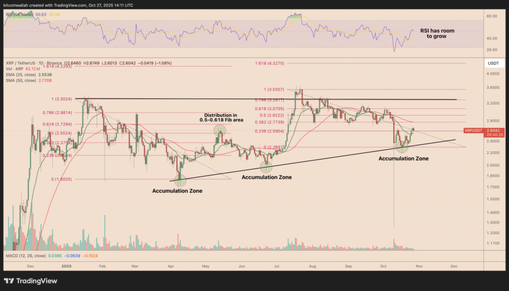 - Điểm phá vỡ quan trọng: Nếu XRP đóng cửa trên 2,77 USD, khả năng bứt phá mạnh mẽ trong tháng 11 là rất khả thi, hướng tới các vùng Fibonacci 0.5–0.618.