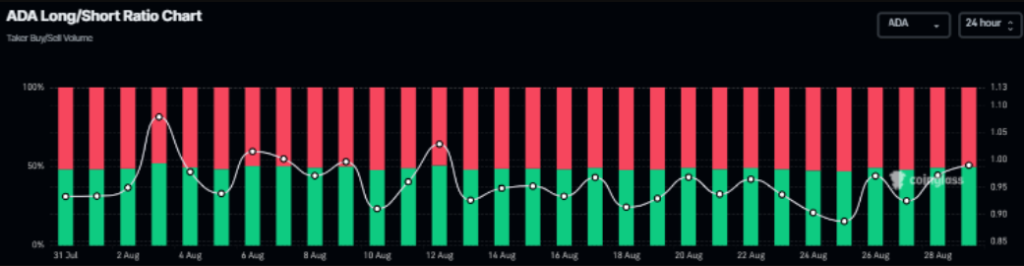 Bên cạnh đó, tỷ lệ lệnh long/short của Cardano cũng cho thấy sự nghiêng về phía các vị thế Long, củng cố thêm niềm tin trong việc phục hồi giá trị của ADA.