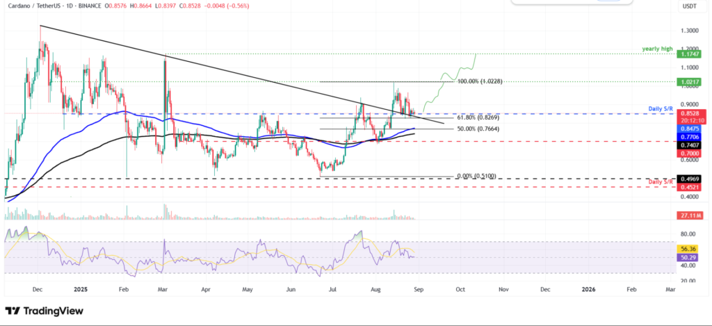 Cardano đã thực hiện một cuộc kiểm tra lại đường kháng cự mà nó từng bứt phá trước đó, tương ứng với mức Fibonacci thoái lui 61,8% tại 0,82 USD vào ngày 22/8, trước khi ghi nhận mức tăng hơn 9%. Mặc dù vậy, đà hồi phục này không kéo dài lâu, khi ADA nhanh chóng có điều chỉnh giảm 7% trong tuần này và vẫn đang cố gắng duy trì quanh vùng hỗ trợ quan trọng 0,82 USD. Tính đến cuối ngày thứ Sáu, ADA đang giao dịch ổn định quanh mức 0,85 USD.