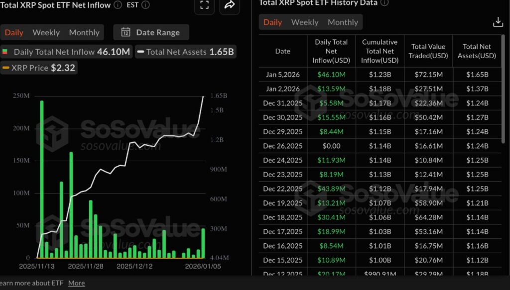 Dòng tiền đổ vào các quỹ ETF XRP giao ngay tại thị trường Mỹ đang được cải thiện rõ rệt. Trong ngày thứ Hai, dòng vốn này ghi nhận mức 46 triệu USD, tăng mạnh so với khoảng 13,6 triệu USD vào ngày thứ Sáu trước đó. Theo dữ liệu từ SoSoValue, tổng dòng vốn lũy kế vào các ETF XRP đã đạt 1,23 tỷ USD, đưa tổng quy mô tài sản ròng của các quỹ này lên khoảng 1,65 tỷ USD.
