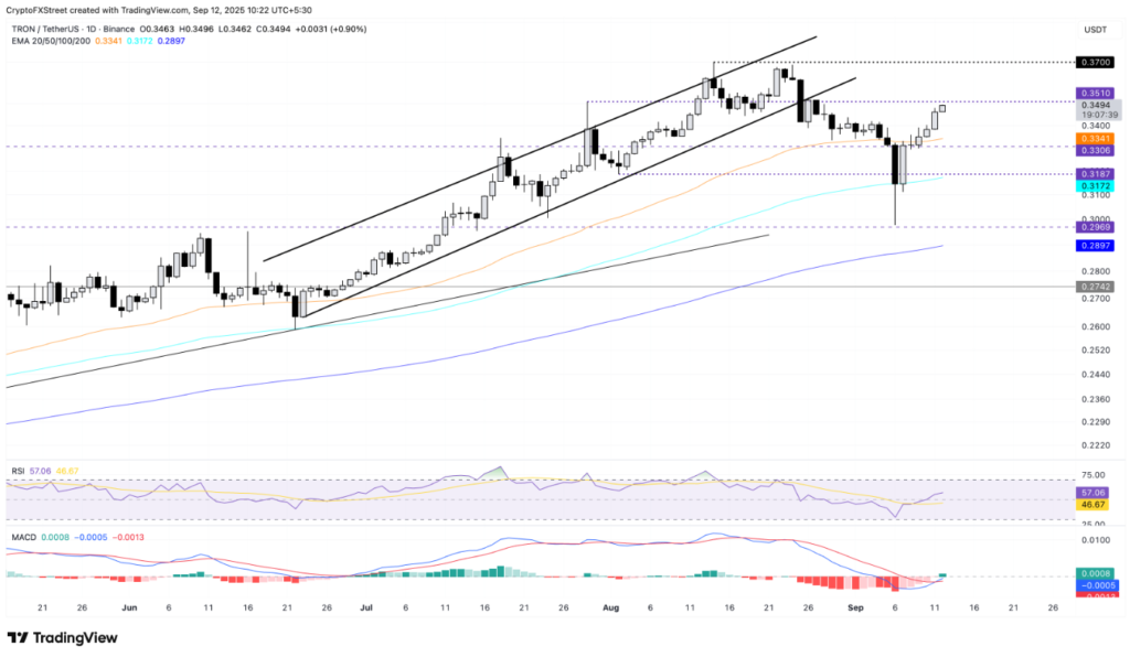 Trên khung thời gian ngày, TRX đang hình thành một mô hình phục hồi chữ V rõ rệt. Sự phục hồi này diễn ra từ đường trung bình động hàm mũ (EMA) 100 ngày, sau khi TRX bứt phá ra khỏi kênh tăng trong cuối tháng 8. Tại thời điểm hiện tại, TRX đang giao dịch quanh mức 0,3400 USD và đang tiến gần ngưỡng kháng cự mạnh mẽ ở mức 0,3510 USD.