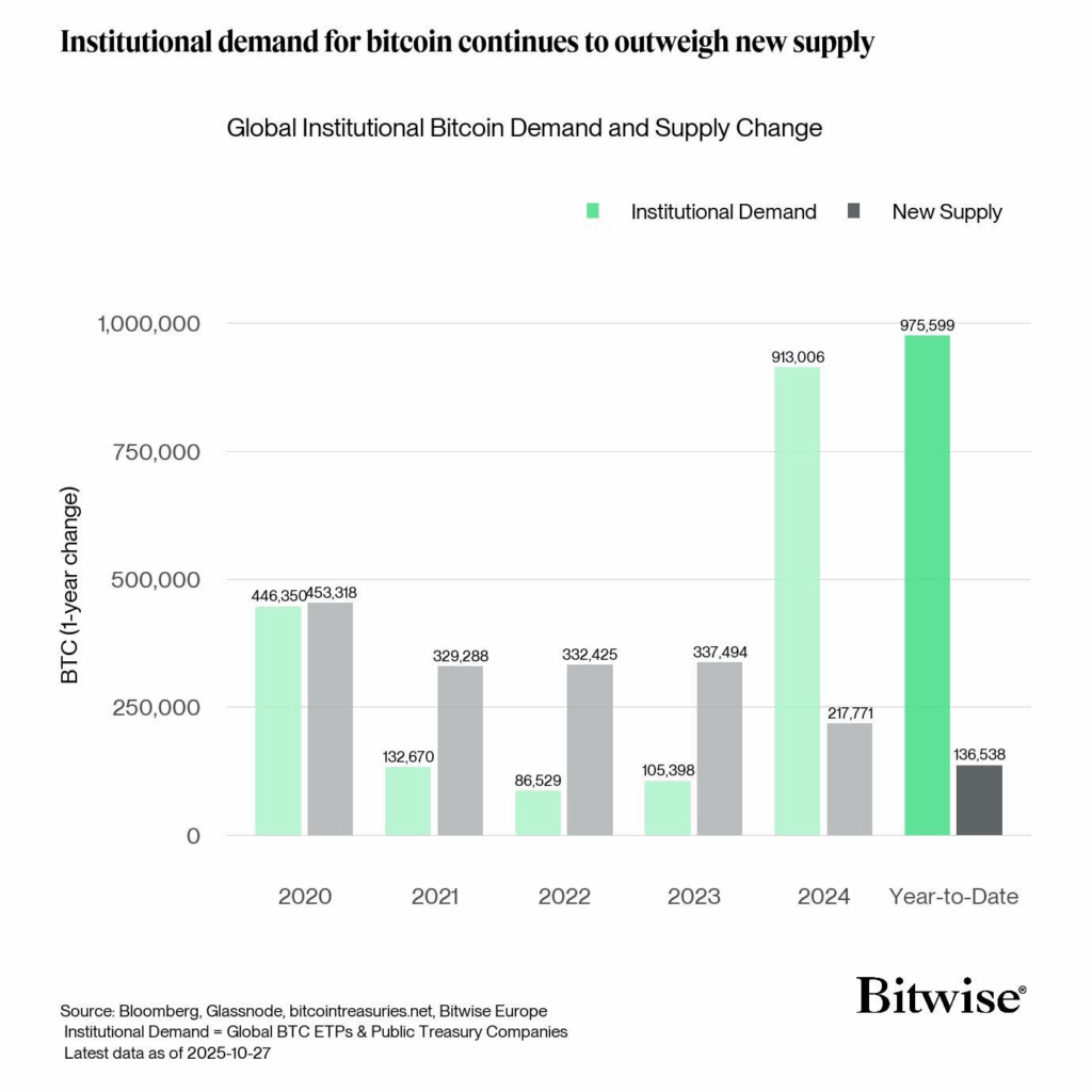Số liệu mới nhất cho thấy, riêng trong năm nay, các quỹ ETF và doanh nghiệp đại chúng đã mua vào tới 975.000 BTC, vượt xa con số 136.000 BTC được tạo ra bởi các thợ đào. Sự chênh lệch này đã gây ra mất cân bằng nghiêm trọng trong quan hệ cung cầu, tạo tiền đề cho một đợt tăng giá tiềm năng của Bitcoin.