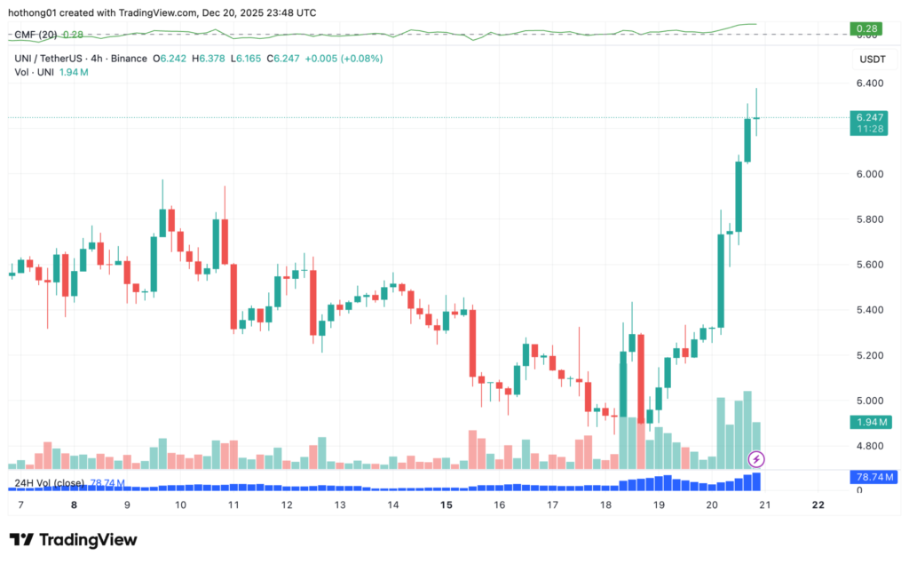 - Diễn biến giá UNI: Tăng mạnh ngay sau khi bỏ phiếu mở cửa, vượt khỏi vùng giá $5,40–$5,50, đạt đỉnh gần $6,27 trong ngày.
