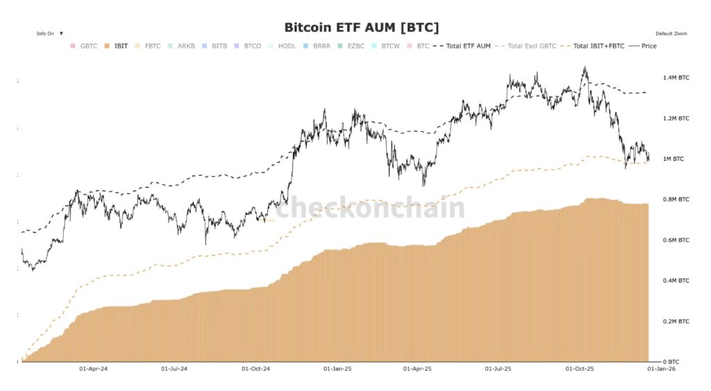 Dữ liệu từ Checkonchain cho thấy, tổng tài sản quản lý (AUM) của các ETF Bitcoin tại Mỹ chỉ giảm chưa tới 4%, từ đỉnh 1,37 triệu BTC xuống còn khoảng 1,32 triệu BTC vào cuối năm. Điều này cho thấy phần lớn nhà đầu tư tổ chức vẫn duy trì niềm tin vào tiềm năng dài hạn của Bitcoin, bất chấp những biến động ngắn hạn.