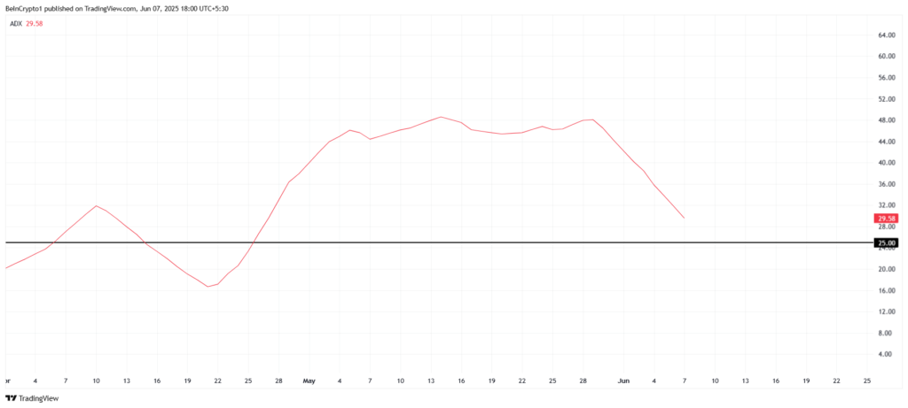 Từ góc độ kỹ thuật, Virtuals Protocol đang đối mặt với những thách thức không nhỏ. Chỉ số Average Directional Index (ADX) hiện đang cho thấy một sự giảm mạnh, biểu thị cho việc động lực giá có thể đang suy yếu. Mặc dù ADX vẫn duy trì trên ngưỡng 25.0, cho thấy một số sức mạnh trong xu hướng hiện tại, nhưng việc chỉ số này có thể giảm xuống dưới mức này là điều cần lưu ý.
