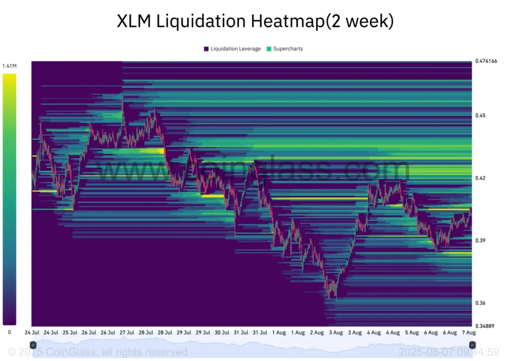 Hơn nữa, bản đồ thanh lý của XLM cho thấy có một lượng thanh khoản lớn tập trung xung quanh mức giá 0,42 USD — nằm ngay trên phạm vi giao dịch hiện tại của XLM. Điều này càng củng cố thêm lập luận về khả năng giá sắp tới sẽ có bước tăng mạnh.