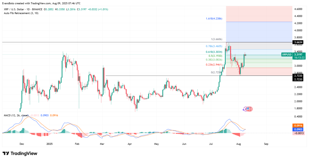 Phân tích biểu đồ hàng ngày chỉ ra rằng XRP đang kiểm tra mức Fibonacci thoái lui 0,618 tại 3,3 đô la, với các ngưỡng kháng cự ở trên lần lượt là 3,46 đô la (Fibonacci 0,786) và 3,66 đô la. Vượt qua mức 3,46 đô la sẽ mở ra con đường cho một mục tiêu giá cao hơn, lên tới 4,23 đô la – mức giá chưa từng thấy trong các chu kỳ tăng trưởng trước.