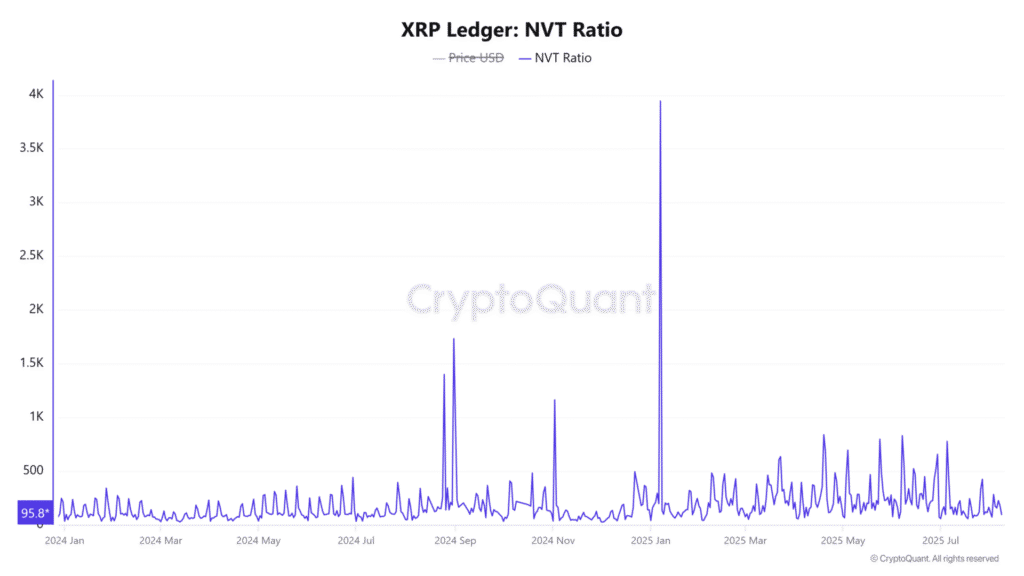 Một chỉ báo tích cực khác là NVT (Network Value to Transactions) của XRP đã giảm tới 46,1% trong vòng 24 giờ qua, xuống còn 95,88. Điều này cho thấy hoạt động giao dịch on-chain đang gia tăng, trong khi vốn hóa thị trường vẫn ổn định, phản ánh rằng giá trị giao dịch đang “bắt kịp” với định giá hiện tại. Theo quan điểm truyền thống, NVT thấp thường liên quan đến hiệu suất mạng lưới cao hơn, cũng như tiềm năng tăng trưởng trong ngắn hạn.