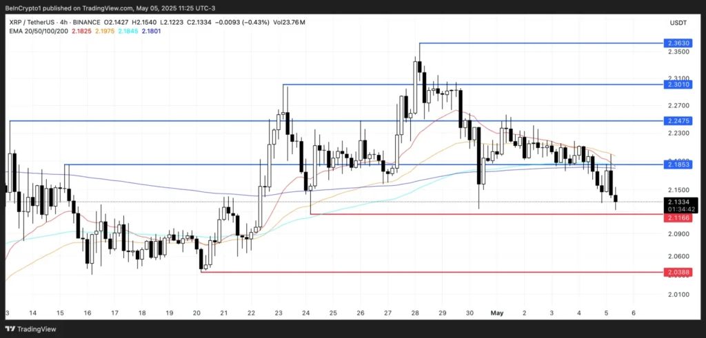 Các đường trung bình động hàm mũ (EMA) của XRP đang cho thấy dấu hiệu yếu đi, với khả năng cao sẽ hình thành “death cross” trong tương lai gần. “Death cross” xảy ra khi một đường EMA ngắn hạn cắt xuống dưới một đường EMA dài hạn, cho thấy rằng một xu hướng giảm dài hạn có thể sắp hình thành. Nếu sự giao cắt này được xác nhận, giá XRP có khả năng giảm xuống kiểm tra mức hỗ trợ tại 2.11 USD.